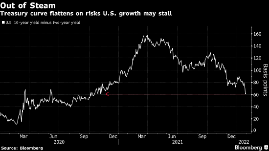 部分人士指出,衡量经济健康状况的美国国债收益率曲线已经在发出警报。2年和10年期国债收益率差本周收窄至61个基点,为2020年10月以来最窄。同时,美国隔夜掉期利率18个月期至2年期远期合约触顶后略微下降,表明一些交易员认为美联储最终将需要放松政策。