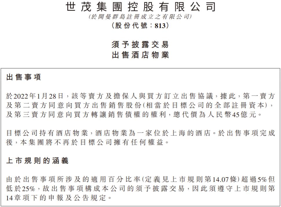 1月28日晚间,世茂集团(00813.HK)发布公告,与上海地产集团签订项目股权转让协议,拟以45亿元出售一家上海的酒店物业(即上海外滩茂悦大酒店)。