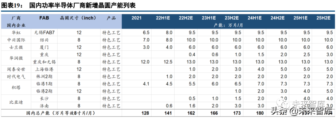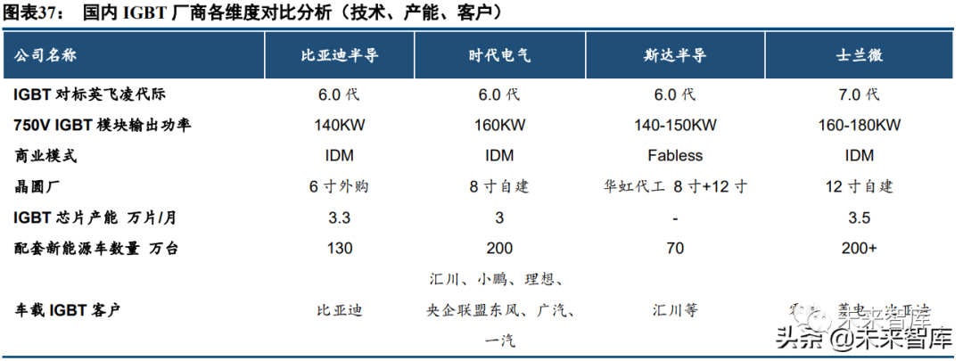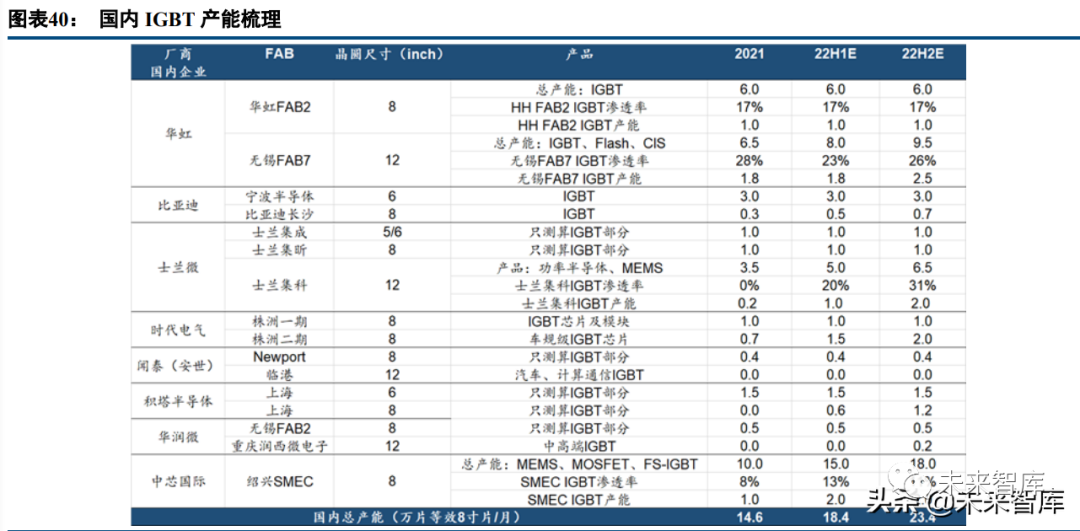 比亚迪作为国内电动车的龙头企业,旗下比亚迪半导体在 2008 年收购宁波中玮的 IDM 晶圆厂开始进入 IGBT 芯片产业链,2012 年导入比亚迪电动车,2015 年自研 IGBT 开始上量,2020 年宁波产线具备 40 万 套电动车 IGBT 模块的配套能力,2021 年收购济南富能 8 寸产线,新增年产能可配套新能源汽车需求约 90 万辆,合计配套 130 万量。