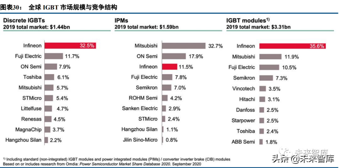 2019 年全球 IGBT 市场规模预计在 64 亿美元,2020 年略有下滑至 60.47 亿美元,2021 年市场开始快速复 苏,预计 2021 年全球 IGBT 市场规模将同比增长 20%,将达到 76.8 亿美元。从市场结构来看,IGBT 主要以 IPM 模块和 IGBT 模组形式为主,两者合计营收占比超过 76%,在分立单管和 IGBT 模块占比最高的是德国英飞凌, 市占率超过 30%,在 IPM 模块市场日本三菱市占率排在第一位,高达 32.7%。从 2020 年 IGBT 模块全球应用 占比来看,工业控制占比 33.5%,是目前 IGBT 最大的应用领域,新能源汽车占比 14.2%。未来,汽车电动化、 智能化推动车规级 IGBT 成为增长最快的细分领域。