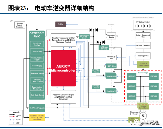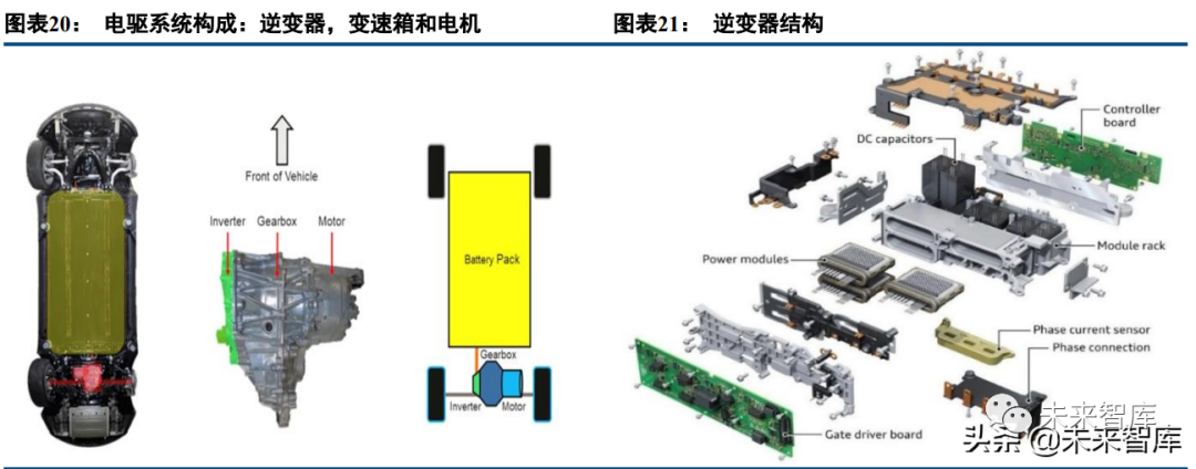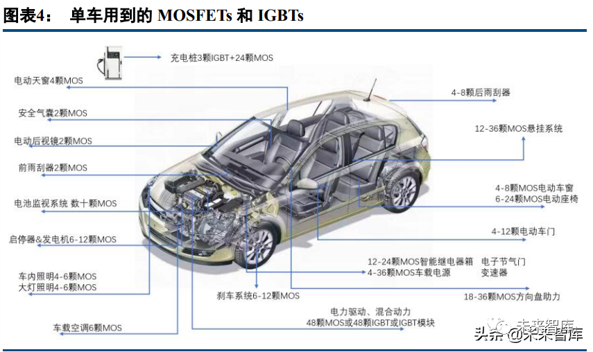 在新能源汽车中,IGBT 主要应用于电机驱动控制系统、热管理系统、电源系统等,具体功能如下:在主 逆变器中,IGBT 将高压电池的直流电转换为驱动三相电机的交流电;在车载充电机中,IGBT 将交流电转化为 直流电并为高压电池充电;在 DC-DC 变换器中,IGBT 将高压电池输出的高电压转化成低电压后供汽车低压 供电网络使用;此外,IGBT 也广泛应用在 PTC 加热器、水泵、油泵、空调压缩机等辅逆变器中,完成小功率 DC-AC 转换。(报告来源:未来智库)