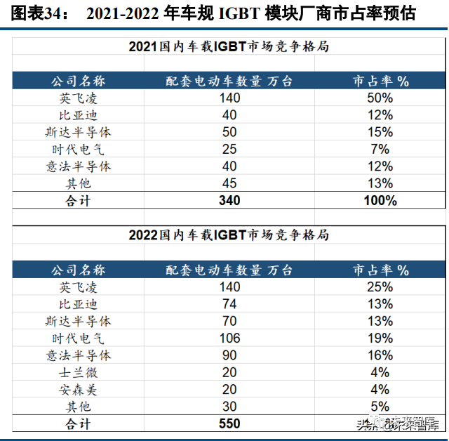 2021 年 10 月开始,全球汽车领域缺芯情况逐渐缓解,我们预计 2022 年国内新能源汽车销量有望超过 500 万辆达到 550 万辆,同比成长 62%。通过我们的产业链跟踪与调研,国内厂商 IGBT 产线在 2021 年底相继投入 量产,预计 2022 年国内车载 IGBT 芯片市场格局将发生较大的变化。首先是市占率提升最明显的预计是中车时 代电气,由于公司月产能 2 万片的 8 寸线在 2021 年底已经投产,满产能够供应 200 万辆新能源汽车所需的 IGBT 模块,拉平全年预估公司车载 IGBT 配套的汽车为 106 万辆,市占率从 7%提升至 19%,其次是士兰微由于 12 寸 IGBT 产线投产,预计明年有望配套 20 万辆左右电动车,市占率达到 4%。美国安森美预计在 2022 年配套约 20 万辆左右的电动车,市占率预计为 4%。比亚迪和意法半导体的市占率预计将保持稳定,斯达和英飞凌的占 比将出现下滑。