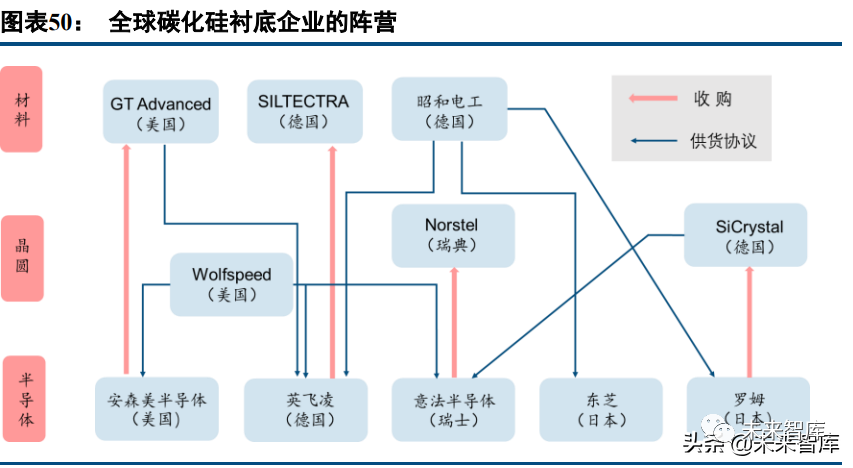 在功率半导体芯片市场,尤其是 IGBT 芯片市场的竞争已经从芯片设计延伸至中游的制造和下游的模块封 装领域,然而进入到碳化硅时代,我们认为碳化硅功率半导体的竞争已经从芯片设计、中游制造和下游封装进 一步向产业链上游的衬底和外延环节扩张。国际大厂很早就意识到了碳化硅之争的关键就在对于衬底资源的控 制权,早在 2009 年日本罗姆就通过收购德国 SiC 衬底和外延片供应商 SiCrystal 实现了 SiC 器件研发的实质性 突破。2018 年英飞凌收购了德国碳化硅晶圆切割领域的新锐公司 Siltectra,通过收购获得了一种称为“冷分裂 (Cold Split)”的材料切割技术,借助这种专有工艺可以高质量低成本的加工晶圆和对晶圆进行减薄,尤其是对 于碳化硅这种超高硬度材料的切割优势非常明显。