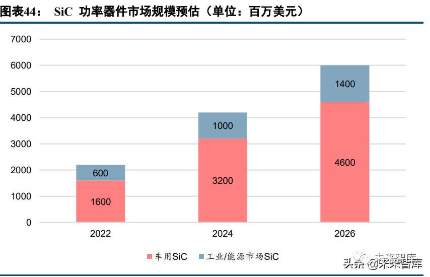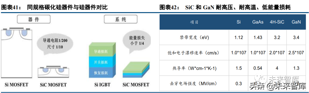 ④ 耐高温、散热能力强。SiC 的禁带宽度、热导率约是 Si 的 3 倍,可承受温度更高,高热导率也将带来功率密度的提升和热量的更易释放,冷却部件可小型化,有利于系统的小型化和轻量化。(报告来源:未来智库)