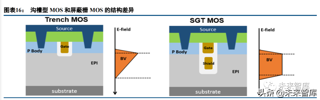 沟槽型 MOSFET,主要用于低压(100V)领域;SGT(Shielded Gate Transistor,屏蔽栅沟槽)MOSFET,主要用于中 低压(200V)领域;SJ-MOSFET,即超结 MOSFET,主要在高压(600V-800V)领域应用。SGT MOSFET(Shield Gate Trench MOSFET)是一种新型的功率半导体器件,SGT 工艺比普通沟槽简单,开关损耗小。再加上 SGT 比普通沟槽工艺挖掘深度深 3-5 倍,可以横向使用更多的外延体积来阻止电压,这也使得 SGT 的内阻比普通 MOSFET 低 2 倍以上,所以 SGT MOSFE 作为开关器件应用于新能源电动车、新型光伏发电、节能家电等领域 的电机驱动系统、逆变器系统及电源管理系统,是核心功率控制部件。