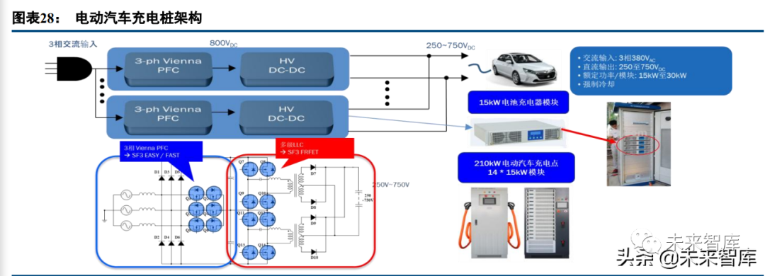 Vienna 整流+LLC 构成了充电桩的基本电路。如果考虑设备成本,使用 Si 基 IGBT 和超级结 MOSFET、 FRD(快恢复二极管)方案更具成本优势;如果需要高功率密度和高效率,碳化硅 MOS/SBD 方案更具性能优 势。PFC 部分更适合使用碳化硅器件,理由有二:其一,高温时导通电阻增加较少,能实现高效率,同时可抑 制发热,使用更小的散热板;其二,碳化硅器件的恢复损耗非常小,开关损耗较小,能够提高工作频率,有助 于输入线圈的小型化。作为硅器件解决方案,Si 基的超级结 MOS 和 IGBT 也是不错的替代方案。价值量方面, 慢充 20KW 以内用半桥工业 IGBT,单桩价值量在 200 元以内,如果采用超级快充 100KW 以上,超大功率的充 电桩会采用 SiC 方案,成本会成倍增加,整体价值量会提升至 1000 元以上。