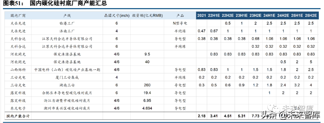 国内供应碳化硅衬底主要厂商包括山东天岳、天科合达、三安光电、山西烁科与河北同光五家,目前在国 内市场销售规模排在前三位的是山东天岳,山西烁科和天科合达。根据公开资料显示,销售规模排在前三位的 碳化硅衬底销售额分别为 3.5 亿(2020 年),3 亿左右(2020 年),1.55 亿(2019 年)。对比未来五家衬底产能 规划,2025 年产能最大的厂商是河北同光,预计月产能达到 5.83 万片,年产能达到 70 万片,满产后产值为 45-60 亿元。排在第二位的是三安光电,厦门三安和湖南三安两地合计碳化硅衬底产能在 2025 年将达到 4.2 万片/月, 山东天岳的碳化硅衬底月产能在 2025 年底将达到 3.5 万片紧随其后,其中 2.5 万片为导电型衬底,占公司总产 能比达到 71.4%。