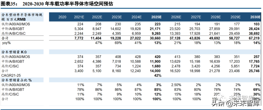 从投资功率半导体的角度,我们更看好的是 IGBT 领域的布局,一方面 MOSFET 的技术相对成熟,另一方 面就是电车的增量功率需求也主要是 IGBT。2019 年到-2020 年国内新能源汽车销售规模为 120-130 万台,增速 相对平稳,2021 年国内新能源汽车销量达到 340 万台,按照单车功率半导体价值为 3000 元计算,对应约 102 亿左右的车载 IGBT 市场规模。预计到 2025 年国内新能源汽车销售量将达到 1000 万台左右,对应需求空间约 为 300 亿左右(不考虑 SiC 对于 IGBT 的替代)。
