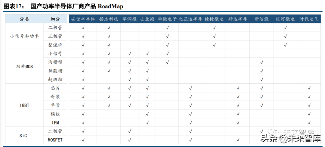 目前国内功率半导体厂商众多,产品线差异也比较大,营收规模较大的厂商主力产品是 MOSFETs,随着电 动车和光伏、风电等新能源发电领域对于 IGBT 的大幅需求增长,各个厂商开始逐步将产品线扩展至 IGBT,部分龙头厂商已经开始布局第三代半导体 SiC 衬底的功率 MOSFET。根据我们的统计,目前国内在功率半导体产品布局最完善的厂商是闻泰科技旗下的安世半导体,首先公司 主力产品线覆盖了晶体管(包括保护类器件 ESD/TVS 等)、Mosfet 功率管、模拟与逻辑 IC 三大领域,小型号 MOSFET 居于全球排名第二,公司汽车类 POWER MOSFET 预计市场地位仅次于英飞凌。其次公司通过提高研 发投入进一步加强了在中高压 Mosfet、化合物半导体产品 SiC 和 GaN 产品布局,同时收购英国 Newport 晶圆厂 100%股权,获得了 4000 片/月的 IGBT 产能,目前公司汉堡工厂已经开始搬入碳化硅设备,预计 SiC MOSFET 新品在 2022 年量产。