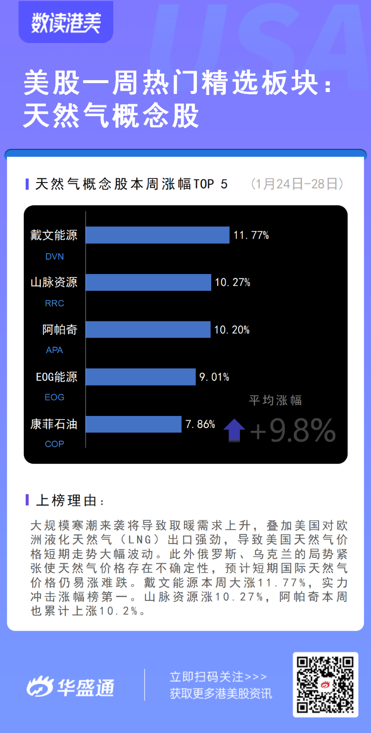 据华盛资讯统计分析,本周美股市场热门板块为“天然气概念”,多只天然气概念股一周涨幅突破10%。涨幅前5只天然气概念股中,戴文能源 $DVN 本周大涨11.77%,实力冲击涨幅榜第一。山脉资源 $RRC 本周上涨10.27%,阿帕奇 $APA 本周也累计涨10.2%。