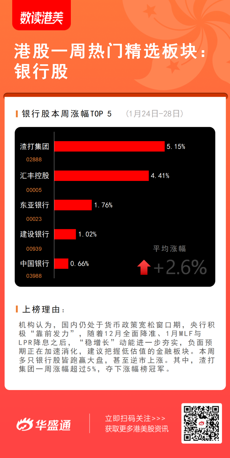 据华盛资讯统计分析,本周港股市场热门板块为“银行概念”。在本周港股整体呈下行走势,恒生指数重挫5.67%情况下,银行股却表现得十分抗跌,多只成分股皆跑赢大盘,甚至逆市上涨。渣打集团 $02888.HK 一周涨幅超过5%,夺下涨幅榜冠军,交易者积极配置高股息股进行防御,汇丰控股 $00005.HK 、建设银行 $00939.HK 分别累涨4.41%,1.02%。