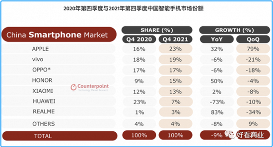 在中国市场,苹果在自然年2021第四季度的几个月里,销量连续第一,市场份额达到历史新高23%;这也是苹果时隔6年后重回中国市场第一。