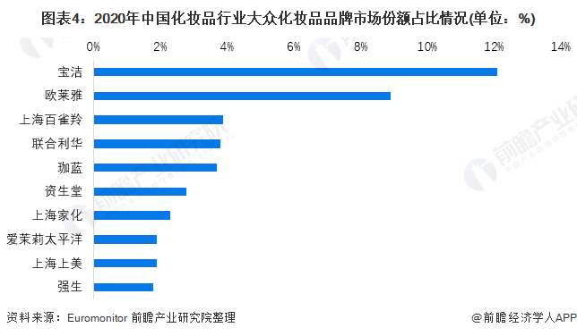 在大众化妆品市场,宝洁占据主要市场份额,为12.1%,其次是欧莱雅,占比约为8.9%。本土品牌百雀羚、珈蓝集团、上海家化、和上海上美占有一定的市场份额,占比分别为3.9%、3.7%、2.3%和1.9%。