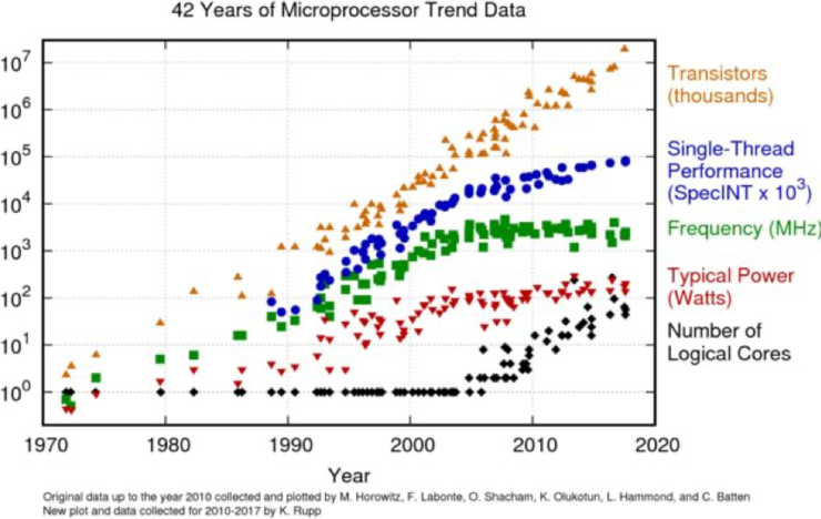 接下来的后摩尔定律时代,架构和系统级优化成为了竞争的关键。2017 年图灵奖的两位得主 John L. Hennessy 和 David A. Patterson 在 2019 年发表了一篇长篇报告《A New Golden Age for Computer Architecture》,他们展望未来十年将是计算机体系架构领域的“新的黄金十年”。
