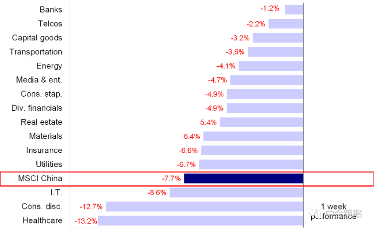 上周全球市场动荡延续,海外中资股市场也随之出现回调,成长板块跌幅尤为明显。整体来看,全球流动性收紧预期放大了对长久期资产的影响,恒生科技指数跌幅达9.9%。其次为MSCI中国指数,下跌7.7%,恒生国企指数和恒生指数则分别下跌6.6%和5.7%。板块方面全线下挫,医疗保健和可选消费板块跌幅超过10%,分别下跌13.2%和12.7%;而银行和电信板块更具韧性,跌幅为1.2%和2.2%。