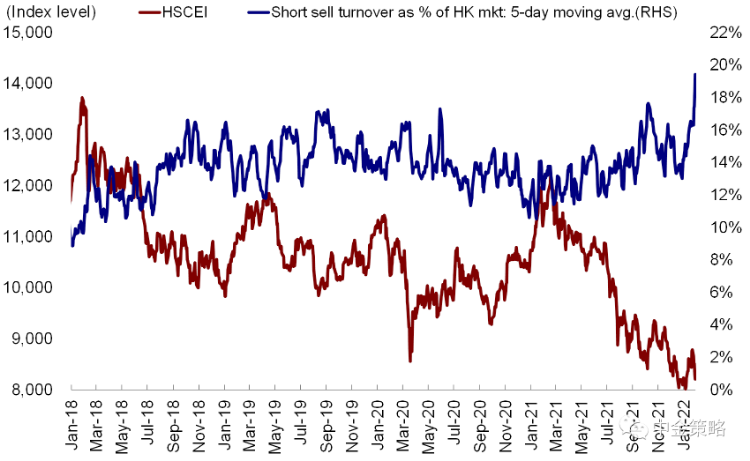 外围环境上,1月美联储FOMC会议结束后美联储主席发表了偏向鹰派立场的讲话,进而引发避险情绪和市场剧烈动荡。美股迅速回吐了早盘的涨幅,10年期美债利率一度逼近1.9%,亚洲和新兴市场也广受波及,美元则大幅走强。具体到港股市场,成长板块领跌,这与美股的成长表现特征一致。不过,我们认为,尽管鲍威尔在加息节奏和幅度等关键问题上的回避引发了市场对未来加息路径的“遐想”,但短期市场的剧烈反应也可能有些过度。上周五美股市场已经有所企稳,而随着市场进一步消化1月份FOMC会议传递出的信息,我们预计包括港股在内的主要海外会场也可能有所喘息。实际上,上周四和周五,港股市场的卖空成交比率一度攀升至21.4%的历史高位,即说明避险情绪突然宣泄,从历史经验来看也通常表明市场短期触底。