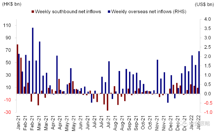 4)2022年开年以来,海外资金和南向资金流入势头保持不变。在上周共计三个交易日(1月27日起港股通暂停交易,将于2月7日重新恢复交易)中南向资金均持续流入港股市场,日均流入规模达到32亿港元,与此前一周的26亿港元相比流入步伐有所加快。值得一提的是,年初以来,除1月4日以外的其它交易日中,南向资金均净流入港股市场。与此同时,上周海外中资股市场也同样吸引到了海外资金的流入,净流入规模26亿美元(此前一周净流入15亿美元)。其中,海外被动型和主动型基金连续五周双双流入海外中资股市场。