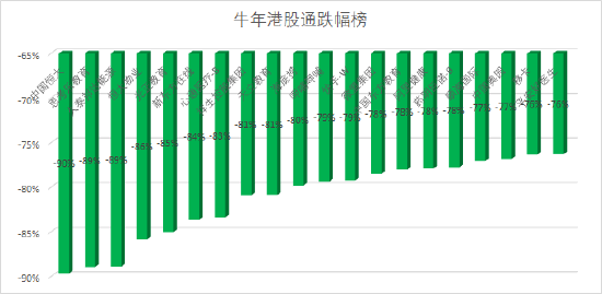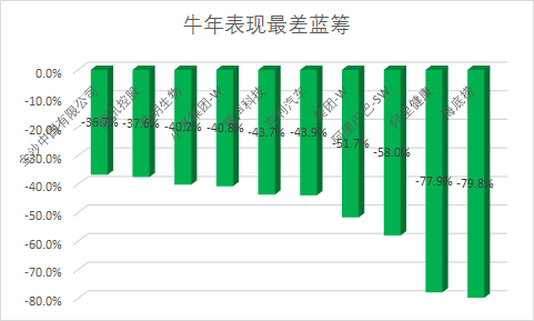牛年表现最差蓝筹来看,海底捞重挫80%领跌蓝筹,阿里健康重挫78%,阿里、美团股价腰斩,小米跌超40%,腾讯跌37.6%。