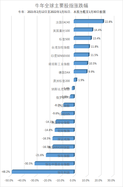 牛年全年(截至港股收官前一天)来看,(本文以下数据范围:从猪年除夕收盘价至2022年1月30日收盘价),全球主要股指具体表现如下:恒生指数全年跌21.6%,恒生科技指数跌48%,创业板指、深指跌幅分别为14.8%和16.5%,沪指跌8%,纳斯达克指数也跌1.4%,法国股指大涨22.8%领涨主要股指表现,标普500涨13.4%,道指涨10.5%。