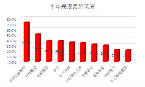 牛年全年来看,港股表现最好的蓝筹是中国石油,牛年涨幅高达72.4%,李嘉诚旗下公司涨幅居前,长实集团涨38.7%,电能实业涨29.9%,长江基建集团涨21.1%。