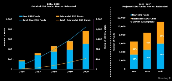 欧洲ESG产品扩张或为全球市场的风向标。2020年,欧洲的ESG共同基金和ETF占到该地区所有ESG产品的25%左右,其中,三分之一的增长来自资产管理公司半路更名为ESG的基金。在投资者需求和前所未有的发展水平的刺激下,我们预计到2025年欧洲ESG基金的市场份额将扩大一倍,其中更名ESG产品将占到一半。