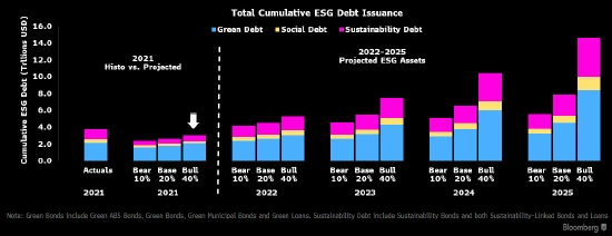 2021年的ESG债务市场规模为4万亿美元,超出了对2021年的牛市情景分析。假设ESG债务的增速只有过去五年的三分之一,那么到2025年,其规模或增至15万亿美元。在全球推进绿色复苏和净零排放的情况下,ESG债务内生增长不太可能放缓。虽然欧洲仍然是ESG债务的主要发行地区,但下一波增长却具多样性:欧盟推出1万亿欧元的“Fit for 55”计划,美国提出1.2万亿美元的基础设施投资计划以及潜在的“重建美好未来(Build Back Better)”法案,表明存在新债发行的空间,更不用提新兴市场开始意识到通过ESG债务市场为转型提供资金。
