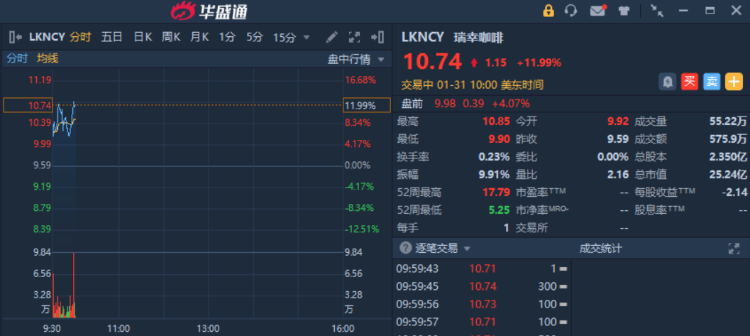 华盛资讯1月31日消息,美股盘初,热门中概股集体走强。截至发稿,瑞幸咖啡 $LKNCY 粉单市场涨近12%,蔚来 $NIO 涨超11%,雾芯科技 $RLX 涨超10%,拼多多 $PDD 涨近10%,哔哩哔哩 $BILI 涨超8%,小鹏 $XPEV 涨超7%,京东 $JD 涨近7%,阿里巴巴 $BABA 涨超4%。