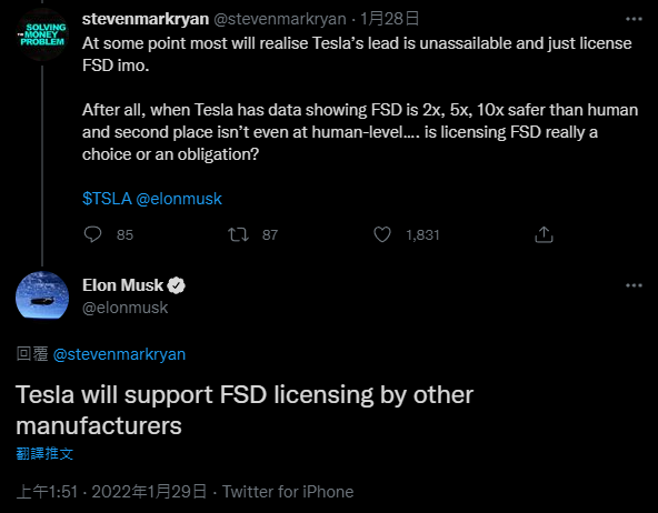 上周末,马斯克在社交媒体上回复网友称:“特斯拉将支持其他制造商的FSD授权。”