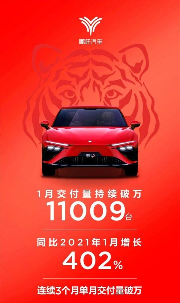 哪吒汽车1月交付11009辆,同比增长402%,连续3个月单月交付量破万。