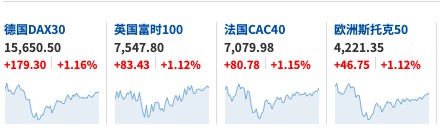 2.截至发稿,德国DAX指数涨1.16%,英国富时100指数涨1.12%,法国CAC40指数涨1.15%,欧洲斯托克50指数涨1.12%。
