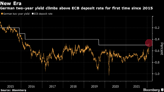 德国两年期国债收益率自2015年以来首次升至欧洲央行存款利率以上,投资者因今年的加息前景而抛售该期限德债。
