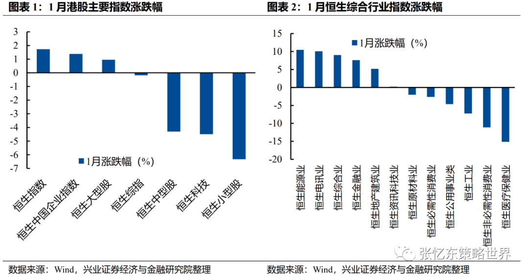 截至1月31日,1月份港股主要指数,恒生指数涨1.7%,恒生国指涨1.4%,恒生综指跌0.2%;另外,恒生大型股涨1.0%,恒生中型股跌4.3%,恒生科技跌4.5%,恒生小型股跌6.3%。行业上,恒生能源业(涨10.5%)、电讯业(涨10.1%)和综合业(涨9.0%)领涨,医疗保健业(跌15.1%)、非必需性消费业(跌11.1%)和工业(跌7.3%)领跌。