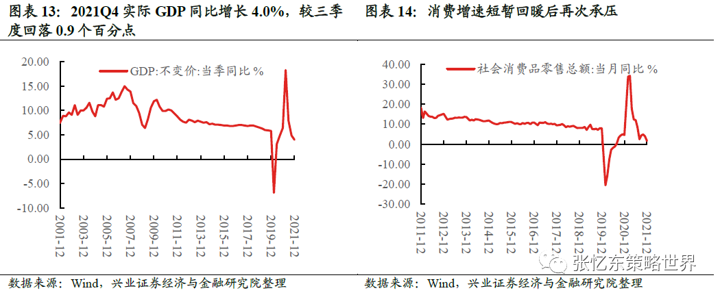在经济增速仍面临较大下行压力的大背景下,2021年四季度,实际GDP同比增长4.0%,较三季度回落0.9个百分点。受疫情反复的拖累,消费增速短暂回暖后再次承压。