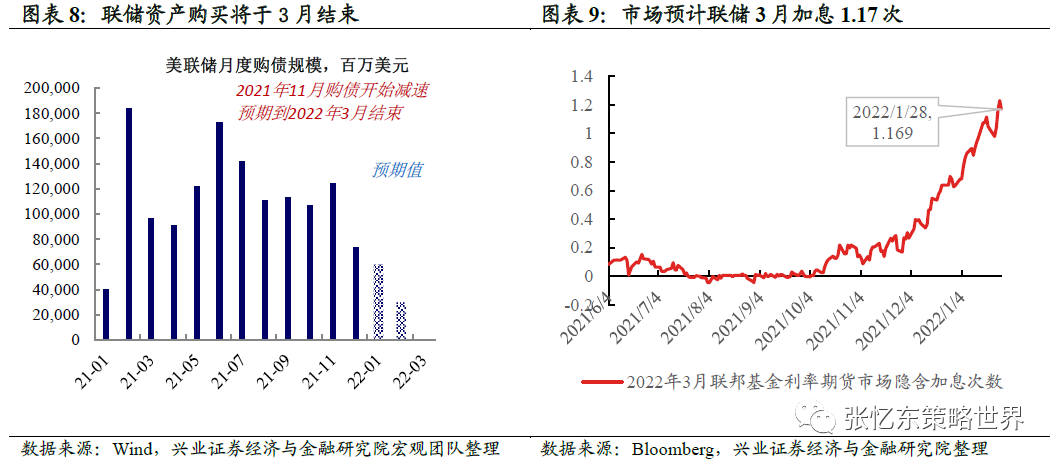 首先,上半年美债长端利率易上难下,2月份回落喘息之后将继续上升。美债联储作为美债市场的重要买盘力量,随着联储购债快速退潮,3月份Taper将结束。基于上半年高通胀,3月首次加息后,联储缩表的讨论也将提上日程,我们判断,美债10年期国债收益率2季度有望突破2%。关于缩减购债,1月FOMC决议维持当前缩减购债步伐,因此2022年3月联储将结束购债;关于缩表,1月FOMC会后答记者问鲍威尔表示“将在加息至少一次之后开会讨论具体缩表事宜”。
