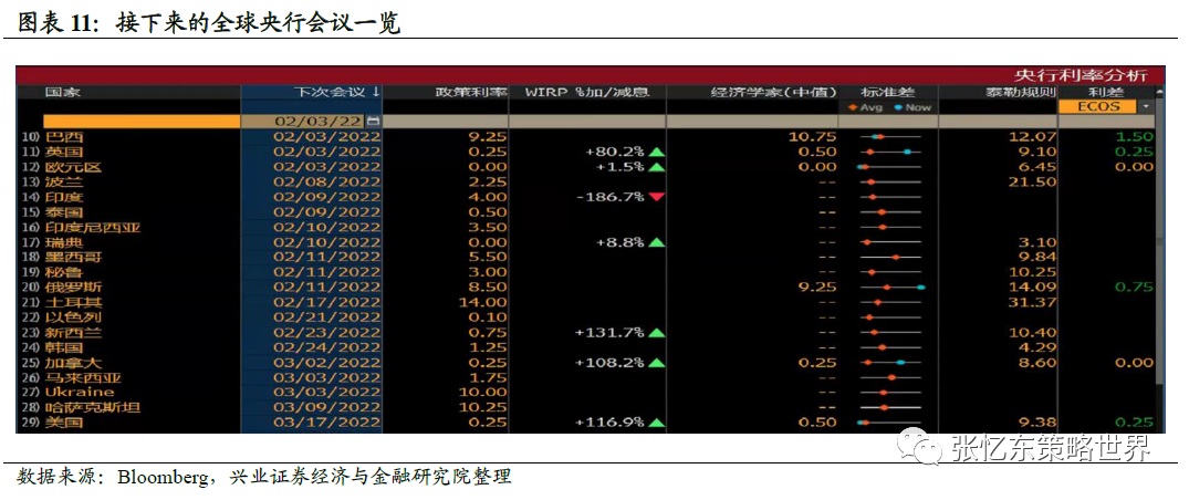 第三,基于全球疫情对全球供应链的影响以及前两年政策“大放水”的后遗症,海外高通胀风险以及海外多国加息共振的风险仍不容忽视。目前新兴市场加息应对联储收紧,发达市场方面,据彭博,市场预计0203英国央行、0223新西兰央行、0302加拿大央行也大概率加息,0203欧洲央行的今年首次利率决议表态也至关重要。
