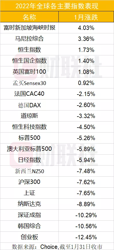 当中,跌幅最大的是A股创业板指数,1月累跌12.45%,涨幅最大的是富时新加坡海峡时报指数,涨幅4.03%。