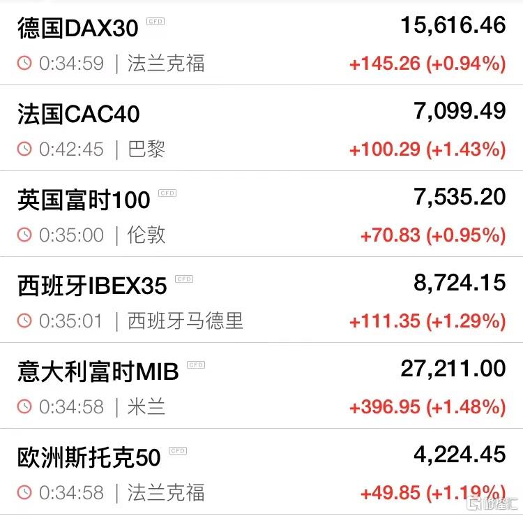 格隆汇2月2日丨德国DAX30指数涨0.94%,法国CAC40指数涨1.43%,英国富时100指数涨0.95%,西班牙IBEX35指数涨1.29%,意大利富时MIB指数涨1.48%,欧洲斯托克50指数涨1.19%。
