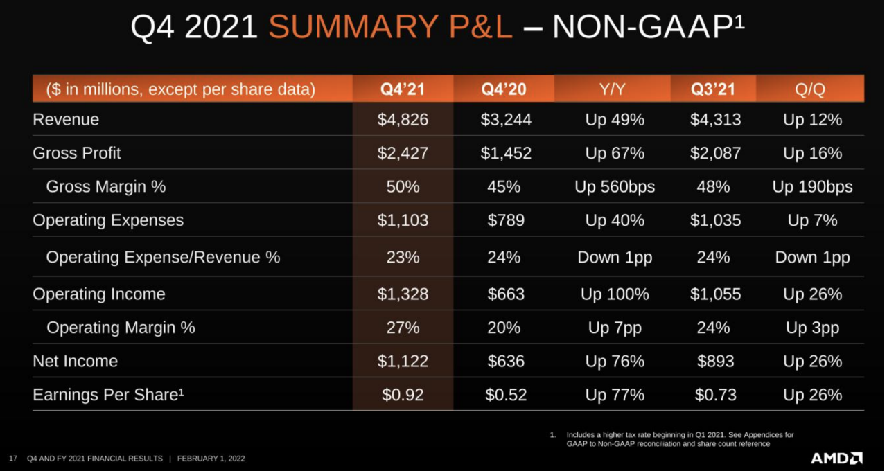 从2021年全年来看,AMD营收为164亿美元,同比增长68%;毛利率提高至48%,较前一年增长了3个百分点。全年调整后每股收益为2.57美元,同比增长25%。