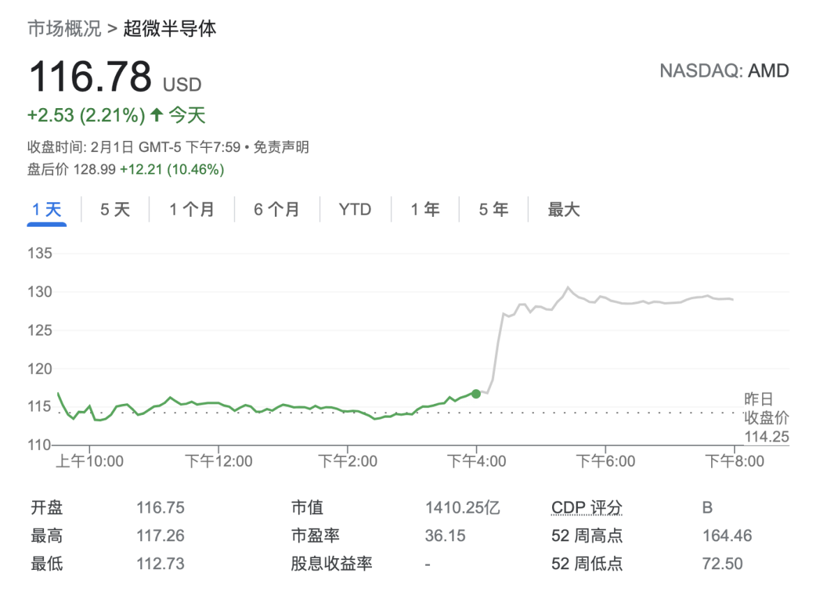 财报显示,在截至12月25日的第四季度,AMD营收为48.3亿美元,较去年同期的45.3亿美元增长49%;经调整后每股收益为0.92美元,同比增长26%,而分析师预期为0.76美元。