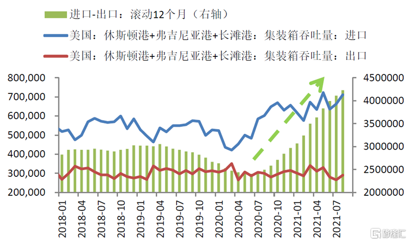 一种很直观且较为普遍的观点认为,美国通胀主要是疫情导致的,因为疫情使得全球的供应链和产业链出现问题,因此,此轮美国通胀是供给侧问题,这当然没有没有错。我们从美国进出口逆差扩大中可以略见一斑。如美国西海岸的港口积压一直很严重,导致集装箱价格大幅攀升。
