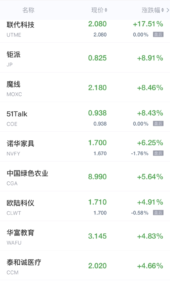 联代科技涨超17%,51Talk涨超8%,华富教育涨近5%,好未来、房天下涨超4%,瑞幸粉单涨近3%,猎豹移动涨超1%。