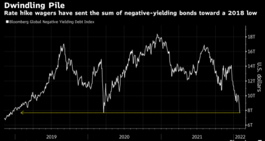 随着近在眼前的加息浪潮推动投资者抛售债券,全球负收益率债券规模已经缩小至三年多来的最低水平。