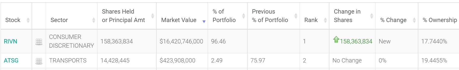 在亚马逊的重仓股中,前两大重仓股便占据整个组合近99%。Rivian(RIVN.US)位列第一,持仓约1.58亿股,持仓市值约164.2亿美元,占投资组合比例为96.46%。