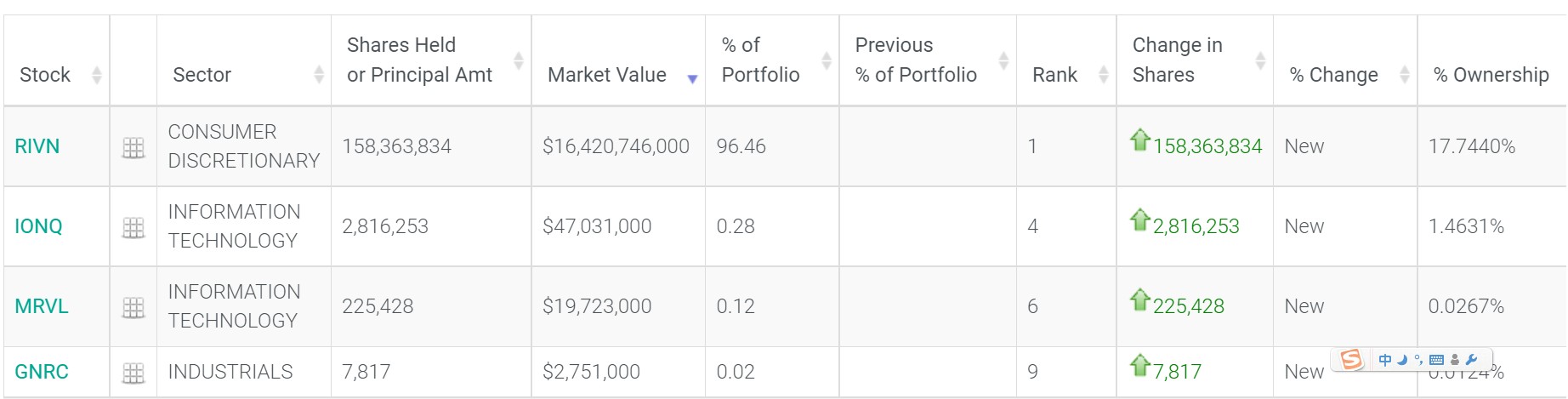 值得注意的是,从持仓变化来看,亚马逊四季度重本建仓Rivian。