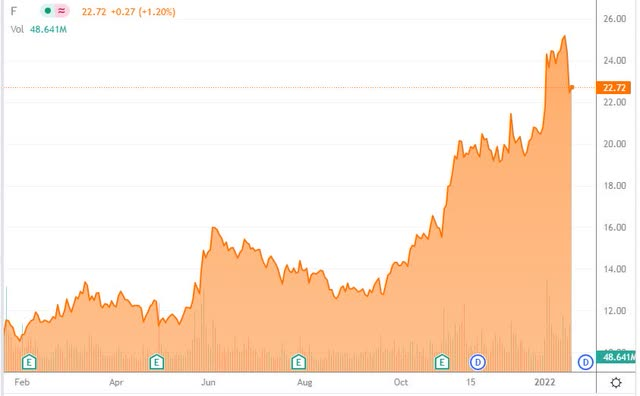 福特拥有39亿股流通股,需要达到每股25美元才能越过2022年1月13日至14 日的1000亿美元市值关口。此后它已经回落,但仍徘徊在1000亿美元区域。
