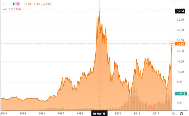 查看福特的价格历史,您可以看到过去20年左右福特价格像过山车一样,也可以注意到它在1999年高达35美元。如果它回到那个水平,福特的MV将是1400亿美元。