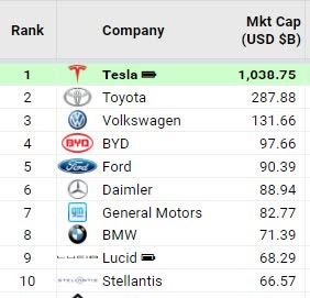 不难发现,特斯拉的MV大于九个竞争对手之和,分别为10387亿美元和9860亿美元。