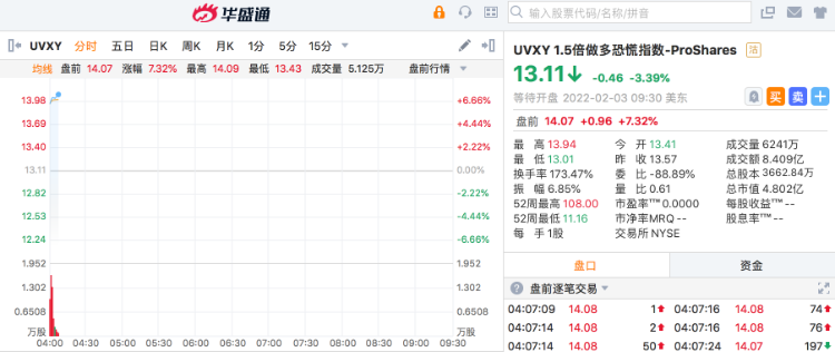 华盛资讯2月3日消息,美股盘前,1.5倍做多恐慌指数ETF UVXY 大涨超7%。三大期指盘前普跌,道指期货跌0.17%,标普500指数期货跌0.94%,纳指期货跌2.02%。