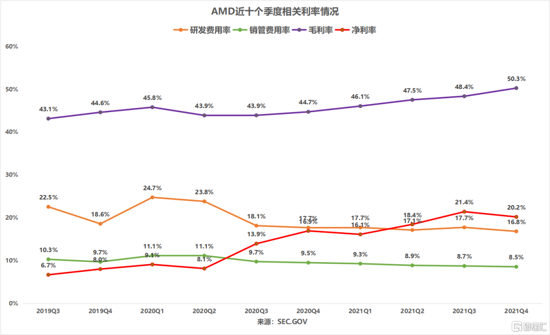 此前,AMD曾表示,对于毛利率的前景,根据长期目标模型,在数据中心、客户端PC业务增长及高利润率产品组合的推动下,公司毛利率有望超50%,这一说法在21Q4得到了印证:毛利率首破50%达50.3%。在缺芯且终端市场需求持续旺盛的背景下,再加上公司若能在22Q1如期收购利润率更高的FPGA龙头赛灵思,那AMD的毛利率保持在50%以上将是大概率事件。