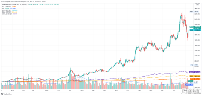 截止22年2月2日收盘,AMD 21年全年涨幅为56.91%,22年至今涨幅为-14.69%,大幅跑输同期标普500指数ETF(SPY:-3.71%)、纳指100ETF(QQQ:-7.38%)及费城半导体指数(SOXX:-8.6%)的涨幅。